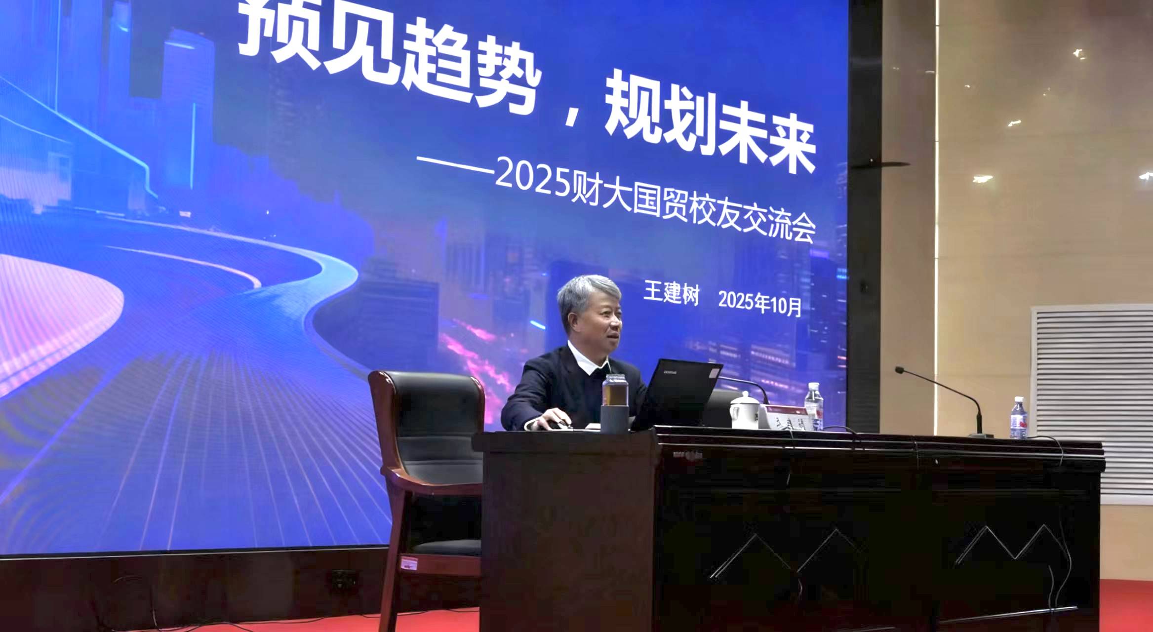 10月20日,经世书院联合校合作发展部、经济学部国际经济与贸易学院,举办优秀校友企业家与新生见面交流会。优秀校友企业家、河南豫发集团有限公司董事长王建树受邀作为主讲嘉宾,与国际经济与贸易学院 2025 级研究生及本科生新生开展深度交流。副校长叶光主持交流会。