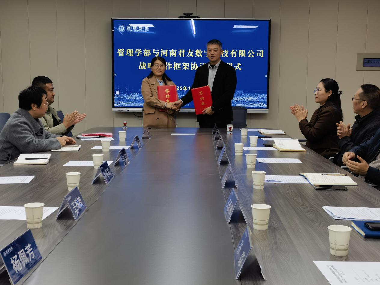 10月21日,管理学部与河南君友数字科技有限公司举行战略合作框架协议签约仪式。校合作发展部常务副部长杨凯,管理学部党委书记贺捷、执行部长王永伟,数据科学与电子商务学院院长崔春生,君友数字董事长徐延军参加仪式。